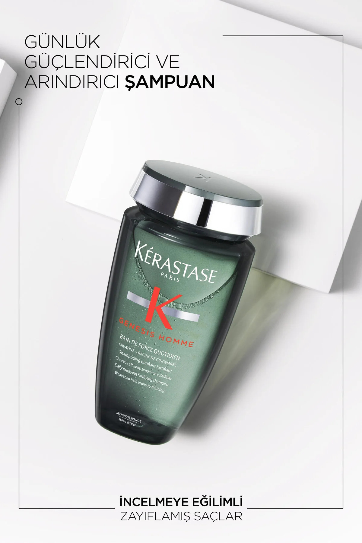 Bain de Force Quotidien, zayıflamış ve incelmeye eğilimli saçlar içindir.; Saç derisini, saçı ve sakalı nazikçe temizler.; Hacim ve doku sağlar.; Daha dolgun saç hissi verir.; Saçı nemlendirir ve yumuşatır.; Temel İçerikler Amineksil: Saçın saç derisine daha sağlam bir şekilde yerleşmesine yardımcı olur ve saç dökülmesini önler.; Kolajenin saç köklerinin etrafında sertleşmesini önler.; Kreatin: Anında daha dolgun bir görünüm oluşturmak için saç telinigüçlendirir ve mevcut saçı dolgunlaştırır.; Zencefil Kökleri: Günlük dış saldırganlara karşı koruma yeteneği ile bilinen zencefil kökü, saç hücrelerinin yenilenmesini hızlandırır ve saç derisini uyarır.; ” Boy:250 ml Kullanma Amacı:Dökülme Karşıtı Cinsiyet:ERKEK Yaş Grubu:ERKEK Cilt Tipi:Tüm Saç Tipleri